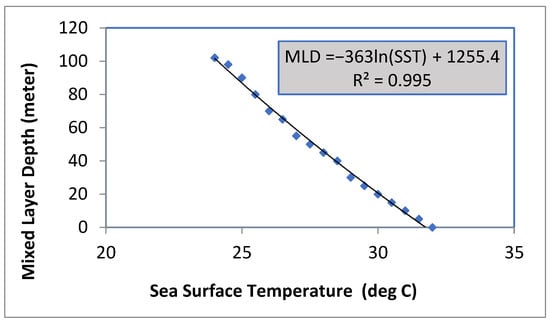 in which T is the current mixed layer temperature, which is the same as the satellite-derived SST at the time of interest (e.g., a time after the hurricane passed), D is mixed layer depth, and T0 (z) is the pre-storm temperature at depth z. Equation (3) was used for finding the mixed layer depth (MLD or D) by using the temperature profiles presented in Section 3.2 as T0 (z). With this approach, the MLD is roughly inversely proportional to the logarithm of SST (Figure 6). This relationship was applied to the MW-OI-derived SST data, producing the MLD maps for different days during Hurricane Katrina. Figure 7 show an example of the calculated MLD over the shelf in comparison to the simulated MLD using the best match parameters for 30 August 2005 at 12:00 UTC. As expected, the maximum MLD values are along the hurricane’s track, with a bias on the right-hand side, and as seen, there is a good agreement between the model and calculations in representing the maximum mixing zone. Both show a maximum mixing depth of 70–80 m on the right side of the track. However, it should be noted that the MLD values within the upwelling area (about 1 RMW from the hurricane’s track) should be used with caution []. The discrepancies between MLDs from the model and calculations using Equation (3) can partly be attributed to the differences between the climatological temperature profiles (used as the initial condition) with the actual profile. It also should be noted that this approach for calculating the MLD from SST data only works for regions affected by the intense hurricane winds over which the hurricane wind is the main mixing force []. Therefore, the mixing depths in the remote areas by the hurricane track are not applicable, nor of interest here.