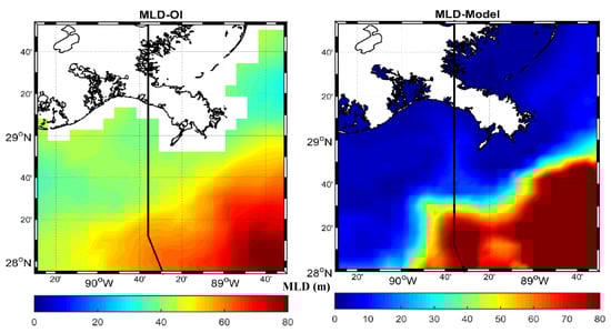 (Left) Calculated MLD based on Equation (3) and MW-OI SST data on 30 August 2005 at 12:00 UTC, and (right) the simulated MLD for the same time and date.
