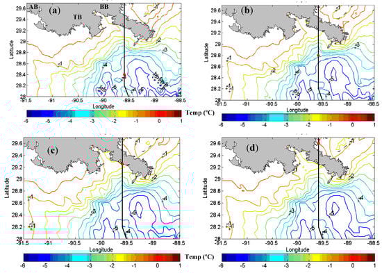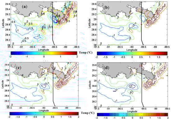 Simulated bottom temperature cooling at (a) −4 h, (b) −2 h, (c) 0 h, and (d) +2 h.