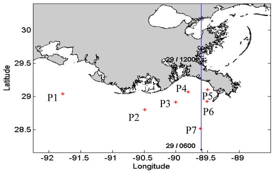 The study area of this paper is the Louisiana continental shelf in the northern Gulf of Mexico (Figure 1). The response of this relatively shallow shelf to hurricanes can be affected by bathymetry and coastal geometry. Weak wind stress and low energy waves in the summer (Mid-June to Mid-September), along with intense solar insulation, produce a stratified layer over the shelf during this season [,]. This stratified layer that can significantly contribute to the bottom water hypoxia [] may be broken down by the occasional passes of tropical storms/hurricanes formed and passing over the shelf, mostly from August to October []. Hurricane Katrina was one of the most disastrous hurricanes in U.S. history with respect to its damages and impacted both the east and west of the Mississippi birds foot delta. Hurricanes Andrew (1992), Ivan (2004), Gustave (2009), and Ike (2009) are other examples of devastating hurricanes that caused substantial damage and fatalities in the northern Gulf of Mexico and Louisiana shelf. Starting as a tropical depression over the Bahamas on 23 August 2005 [], Katrina reached a category 5 Hurricane on 28 August after passing over the warm waters associated with the Loop Current []. The hurricane degraded to some extent as it approached the Louisiana shelf. In the early morning (UTC) on 29 August, as a category 3 hurricane, it made its first landfall between the Grand Isle, LA, and the Mississippi River mouth. Figure 1 shows the track of Hurricane Katrina as it traveled in the northern Gulf of Mexico.