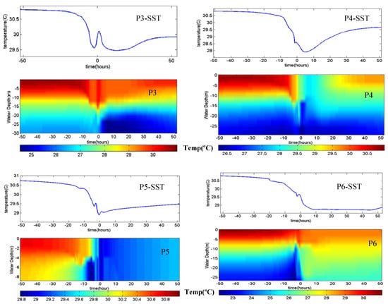 Time variations of simulated SST and vertical temperature at P3–P6, for 50 h before and 50 h after the time that Katrina passed the closest proximity of this point; upper panel for each station is SST, and the lower panel for each station is the temperature across the water column for the same period (horizontal axes in all panels shows relative time).