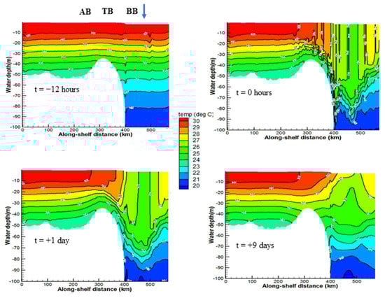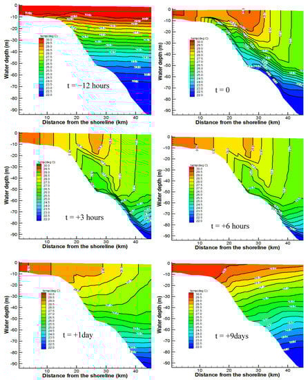 Similar to the east–west section, the temperature response along the north–south transects is presented for six different times, i.e., hours −12, 0, 3, 6, 24 (+1 day), and +196 (or 9 days). Several transects over the Louisiana shelf were examined to reveal the mixing and re-stratification during and after Katrina. The mixing and re-stratification patterns for all sections were similar, and the differences were mostly regarding the intensity of mixing that varied depending on the distance from Katrina’s track. Here, the simulation results across two cross-sections, one on the left side of track (A) and one on the right side (B), which are described in detail. Temperature variations along these two transects and across the water column are shown in Figure 13 and Figure 14.