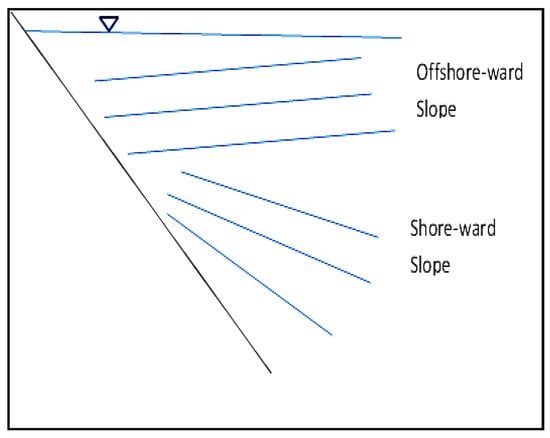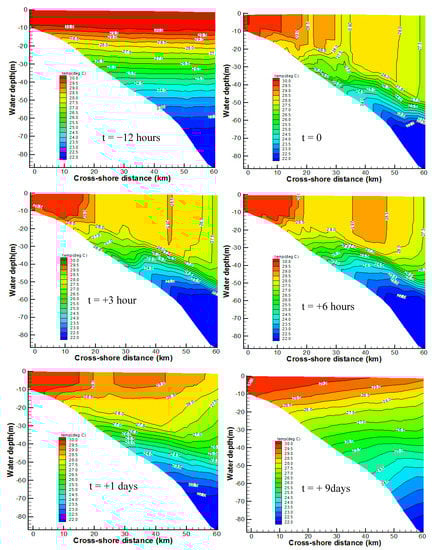 The investigation of temperature variations across east–west sections and north–south transects showed that post-storm temperature recovery and shelf re-stratification start several hours after the hurricane’s landfall with a substantial re-stratification after 1 day. Vertical temperature profiles across the transects, especially those located east of the Atchafalaya Bay, were affected by two different forces. The upper part of the water column was mixed by the hurricane-induced surface turbulence and vertical shear, while the pressure gradient caused upwelling across the lower part of the water column. By the combination of these two forces, a baroclinic response across the water column was produced. Offshore-ward currents were generated within the surface mixed layer on the right side of the track, and a compensative shore-ward current was dominated within the lower water column []. This compensative bottom current has also been reported by Chaichitehrani et al. [] during severe cold front events. On the right side of the track, current directions across both upper and lower parts were reversed. After the hurricane, the force was removed, currents started a geostrophic balance phase that caused south-eastward current over the inner-shelf. Similar pot-storm surface currents and their associated deep water reverse circulations were reported by Keen and Glen [] for Hurricane Andrew (1992). The pressure gradient produced as a result of vertical and horizontal water density variations triggered the re-stratification. At the next stage of re-stratification, the offshore-ward advection associated with the geostrophic currents re-distributed isotherms and sloped them in an offshore-ward direction. Current vectors rotated clockwise under the geostrophic balance and directed southward about 3 days after the landfall. This current lasted for several days and made more contributions to the advection of surface water offshore-ward and reshaping the isotherm toward a re-stratified shelf. The general pattern of re-stratifying isotherms across the water column over the Louisiana shelf after Katrina’s landfall is presented in Figure 17. Although a well-developed shelf-wide stratification was achieved 10 days after landfall, isotherms were still inclined offshore-ward, and SST was about 1 °C smaller than the initial value. Simulations for longer times after the landfall showed that even after 20 days, isotherms were still tilted. This suggests that solar insolation may play an essential role in re-stratifying the shelf, as examined by Allahdadi and Li [] for the Louisiana shelf. They showed that the summertime solar insolation significantly stratifies the shelf and increases SST up to 1 °C after almost two weeks.
