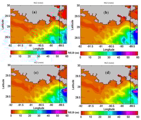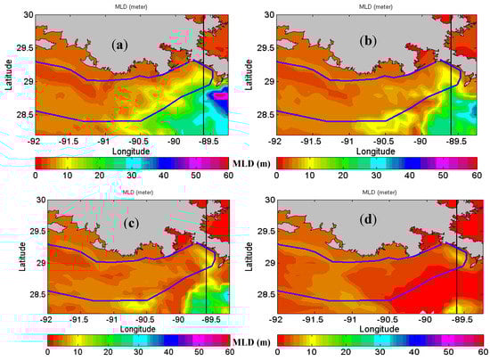 Variations of simulated MLD over the Louisiana shelf at different times: (a) −4 h, (b) −2 h, (c) 0 h, (d) +2 h.