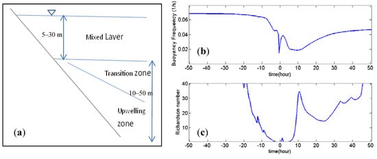 Simulation results for water temperature response across the east–west sections and north–south transects indicated that during Hurricane Katrina, water column properties were affected by both turbulence mixing and upwelling/downwelling depending on the relative locations with respect to the eye and shelf bathymetry and geometry. Turbulence mixing is the dominant force across the water column at locations within 1 to 1.5 RMW from the eye [], while at the interior area with a radius less than 1 RMW, upwelling depresses the mixed layer induced by turbulence mixing []. The interaction between turbulence mixing and upwelling determines the temperature and mixing properties over the Louisiana shelf. Both mechanisms are significant for most locations, especially those located east of Terrebonne Bay. A simple conceptual diagram of water column mixing induced by Katrina over the inner-shelf is shown in Figure 16a. A mixed layer was produced by turbulence mixing for the upper half of the water column, while the lower part of the water column was affected by upwelling. A transition zone of oscillatory temperature existed between these two zones. These oscillations caused mixed layer deepening when turbulence mixing was strong, upwelling was suppressed, and large mixed layer depths resulted. However, in the absence of strong turbulence mixing, the oscillations dissipated with the progression of upwelling.