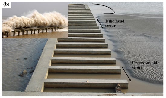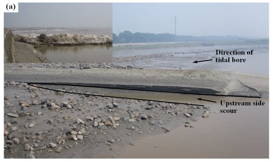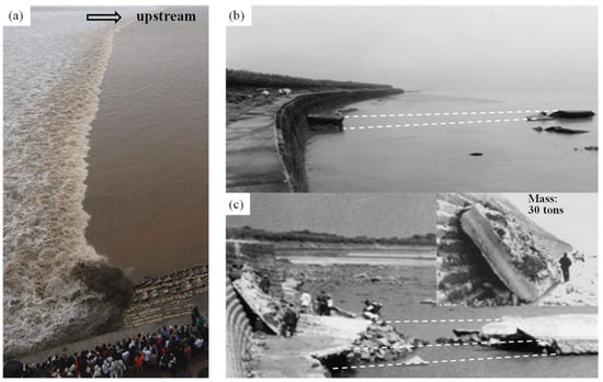 When a tidal bore moves upstream along the estuary, the infrastructure on both riverbanks, such as seawalls, bank slopes, apron slabs, spur dikes, pier foundations, and wharf facilities, is strongly affected by the tidal bore [25]. When a low spur dike blocks the tide bore, the water level facing the surface of the spur dike is sharply increased, resulting in a significant drop between the upstream and head of the dike, falling turbulent currents, and scour hole on the backside. As shown in Figure 1, spur dikes seriously collapse in severe cases caused by tidal bores. When encountering high spur dikes, the tide carrying the backwater of the tidal bore is higher, and even overtops the seawall. At the head of the spur dike, there are often scour holes caused by the concentration of water flow. Large blocks such as caissons and block stone reinforcement cages for dike head protection are washed away owing to the approach of scour holes, foundation instability, and strong tidal currents. On impervious revetments, such as aprons and the surface of spur dikes, the difference between the upper and lower pressures of the revetment under the action of a tidal bore constitutes the jacking force, which can sometimes overturn a large area of the concrete body as a whole (Figure 1c).