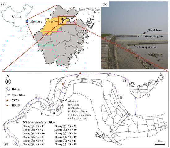 As shown in Figure 2, the QR estuary is a funnel-shaped macro-tidal estuary with a celebrated tidal bore [26]. The width of the QR estuary at the mouth is 100 km, and the total length of the QR estuary is 300 km. The dam of the Fuchunjiang Hydropower Plant has controlled the upstream of the QR estuary since 1968, and the downstream is connected to the East China Sea. The construction of large-scale spur dike groups in the QR estuary began in the Yongzheng (1722–1735) period of the Qing Dynasty. The Tashan spur dike (Figure 2c) was completed in the fifth year of Qianlong (1740) and pioneered the construction of the QR rockfill spur dike. In 1928, a group of spur dikes was built on the banks from Xixing to Zheshan in the Hangzhou section of the QR; a concrete armor was used for the first time, which became the embryonic form of the modern spur dikes of the QR. According to incomplete statistics, from the confluence of the Puyang River to the Changshan sluice section, there are more than 180 spur dikes for riverbank protection.