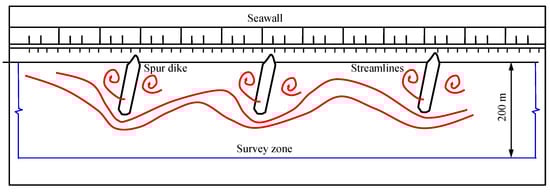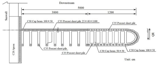 Spur dikes in the QR estuary are built to protect tidal flats along the riverbank to enhance the overall stability of seawalls. A low spur dike (Figure 2b) is constructed first by dumping stones, and then the covering masonry is laid and a caisson filled with rocks is placed at the head to prevent scouring. The length of a spur dike is approximately 100 m when used to protect the seawall toe in the river section with tidal bores in the QR estuary. The spacing between two spur dikes is three times the spur dike length. Impacts of strong tidal bores and turbulent flows around the head of the spur dike will carry away a large amount of sediment and rubble from the dike head, where deep scour holes are formed, leading to the collapse of the dike head, hollowing and fragmentation of the covering, and later damage to the whole groin. Numerous experiments have been carried out to investigate tidal-bore-induced failures of spur dikes. In 1999, the concept of a sheet-pile groin (Figure 2b) was proposed and later applied to engineering projects [27,28]. Figure 3 shows the plane layout of a sheet-pile groin.
