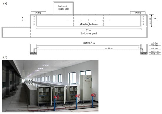 Model layouts: (a) schematic diagram of the flume model test and (b) laboratory flume.