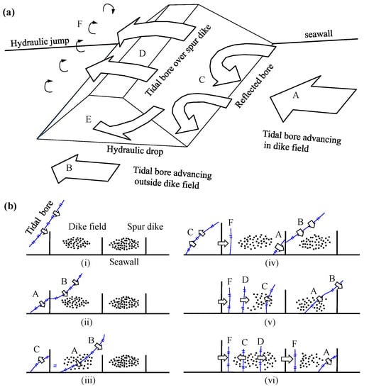 When a tidal bore arrives near the spur dike, it can be roughly divided into two parts: one is in the dike field (A) and another is in the main channel outside the dike field (B), as shown in Figure 6a. When there is no spur dike, the two parts are connected in a line. When crossing the dike, the situation changes dramatically. Part B moves upstream at the original speed and reaches the dike field in advance. Part A propagates in the dike field blocked by the spur dike, and the water level increases. Firstly, the reverse downward reflected bore (C) is formed; then, the overtopping flow (D) crosses the dike crest. The flow creates a descending flow on the dike surface, a hydraulic drop (E) at the dike head, and a hydraulic jump (F) at the upstream dike toe; finally, it continues to move upward in the form of a tidal bore. In every place between the two spur dikes, three parts pass through successively, i.e., oblique incidence part A outside the spur dikes, reflected part C in the upstream spur dikes, and overtopping part D across the spur dikes.