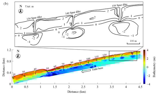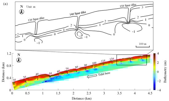 During the dry season (from November to February of the next year), the dike field is in a continuous siltation state. The scour hole on the upstream side of the spur dike has a small range, which is in a long strip shape and 1–2 m wide, so it is not obvious on the map with a scale of 1:2000. Because, if the map-to-ground ratio was 1:2000, the 2000 mm (2 m) in real observations is represented as only 1 mm on the map. Generally, after the spring tide, the riverbed elevation is the lowest in October. The upstream side of the spur dike is mostly lower than other areas of the dike field. As shown in Figure 8b, scour holes can be clearly caught on the 1:2000 survey map at the upstream side of 13# and 14# spur dikes.