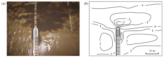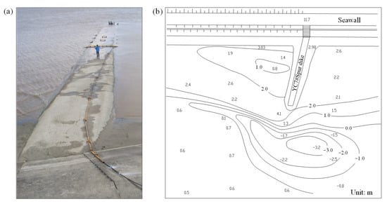 Measured local scour holes around the YC7# spur dike: (a) a site photo of the spur dike and (b) a survey map. The position of the YC7# spur dike is marked by a red five-pointed star in Figure 2.
