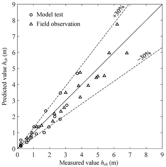 Comparisons of measured and predicted scour depth at the dike head (hsh) using Equation (10).