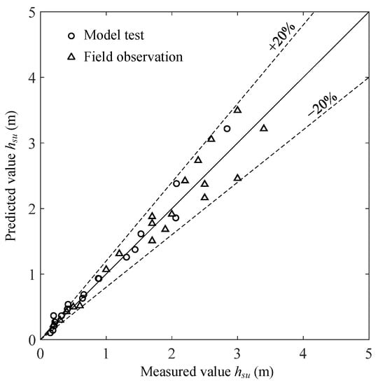 where ku is the correction coefficient, which is also related to the permeability of the spur dike and is generally taken as ku = 0.5–1.0. Figure 11 shows the comparison between the predicted scour depth at the upstream side of the spur dike using Equation (11) and the field measured value. The results show that the predicted value is in good agreement with the field measured value, and the relative error is within 20%. The coefficient of determination (R2), mean absolute error (MAE), and root mean squared error (RMSE) were found to be 0.92, 0.18 m, and 0.25 m, respectively.