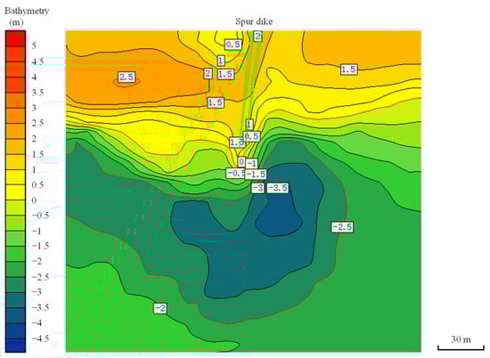 Measured local scour holes around the HN16# spur dike. The position of the HN16# spur dike is marked by a red triangle in Figure 2.