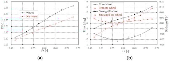 In order to understand the influence of the wheels on the resistance of the PJPWAV, this paper compared the resistance of the bare vehicle with and without wheels, as shown in Figure 8 and Figure 9. It can be seen that, under the influence of the wheels, the resistance of the amphibious vehicle increases significantly, and it becomes more obvious with the speed increase. At the same time, the draft and aft trim of the amphibious vehicle are also increased, and the change in draft is more obvious.