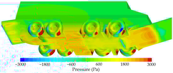 The wheels and wheel wells of the amphibious vehicle in this paper are large in size and many in number, which promotes the formation of convex and concave structures at the bottom of the wheel longitudinal section. These convex and concave structures prevent the flow from passing smoothly along the vehicle bottom, which causes the flow to violently rush the wheels and wheel wells, as shown in Figure 13.