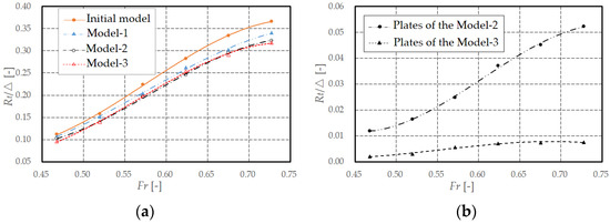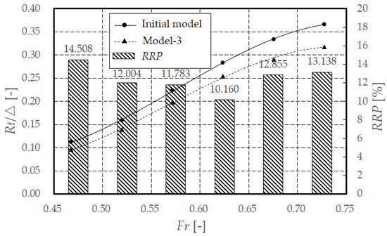 The resistance of the initial model and the Model-1 at various speeds are shown in Figure 18. The RRP of Figure 18 represents the resistance reduction percentage of the Model-1 relative to the initial model. It can be seen from it that, compared with the initial model, the Model-1 has less resistance at each speed. In detail, when 0.468 < Fr < 0.520, increasing wheel retraction can reduce the resistance by about 4%, and when 0.572 < Fr < 0.728, the resistance reduction effect is better, which can reach more than 6.9%.