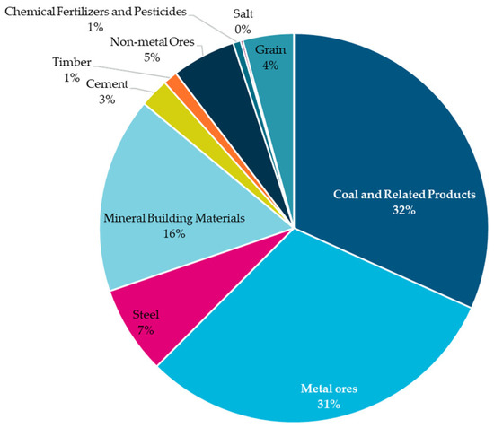 As shown in Table 1, COSCO, China’s largest shipping company and one of the world’s largest maritime companies, estimated China’s dry bulk shipping trade in 2021. Overall, China’s international dry bulk shipping volume was estimated at 2011 million tons. Specifically, the largest volume of freight occurred between with Pacific, followed by Latin and South America and Asia (excluding South Asia). In terms of the types of commodities traded, we compiled the latest dry bulk throughput of China’s coastal ports published by China’s National Bureau of Statistics (2020) [47] (see Figure 1). As a large industrial country, China’s trade in iron ore and coal dominates the overall dry bulk trade with a share of over 60% and is dominated by import trade.