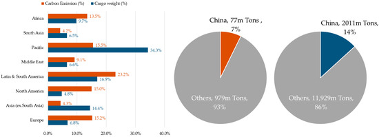 As shown in Figure 2, it is noteworthy that China’s dry bulk trade with the Pacific region amounted to 34.3%, but the share of overall carbon emissions was not high, which was comparable to that of Europe and North America, at around 15%. This may be due to the fact that larger dry bulk carriers are more carbon-efficient per ton of cargo compared with other regions, in addition to the shorter sailing distances between China and Australia, the major trading partner in Pacific. Moreover, China’s dry bulk trade volume (by net weight) was only 13.2% of the global total in 2021 (15,200 million tons, estimated by IHS Markit [48]). This means that China’s dry bulk maritime trade on average created fewer emissions than the global average. This is because of the relatively short sailing distances between China and its trading partners (almost 60% of China’s dry bulk trade is with Asia and the Pacific).