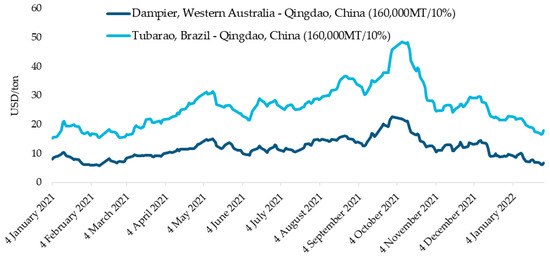 Of course, China has recently been trying to diversify its sources of iron ore. For instance, compared to 2019, the volume of iron ore exported from India to China increased by over 90% in 2020. At the same time, there has been an increase in ton-mile trade by bulk carriers on the Africa–China route, which may be a result of more iron ore being shipped from South Africa [50]. In addition, Guinea could also reportedly become a new supplier of iron ore to China, as it has largely untapped reserves of high-quality iron ore and is scheduled to begin shipping iron ore in 2026 [51,52]. However, the introduction of a carbon tax could hinder this transition process due to the additional shipping costs.