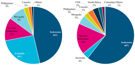 China is also a global leader in coal imports. The major trading partners for China’s coal imports in 2020 and 2021 are shown in Figure 6. We found a significant change in China’s coal import trade pattern, with Indonesia controlling 46% to 60% of imports. Conversely, Australia’s coal imports fell from 26% to 4% as a result of the COVID-19 pandemic and tensions between China and Australia.