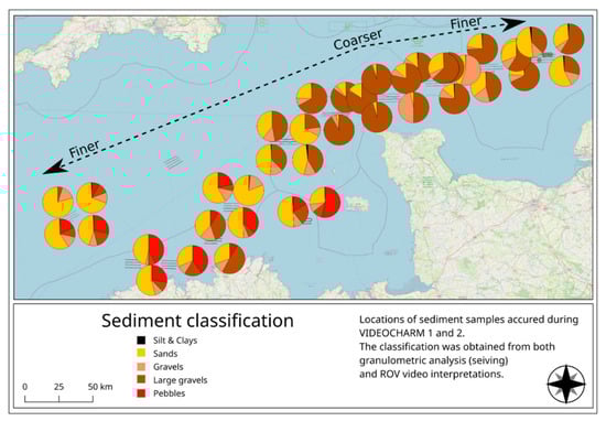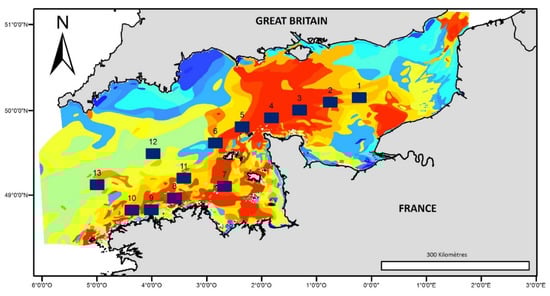In the framework of the CHARM (Channel Habitat Atlas for Marine Resource management) project, the role of the macrobenthos as a fundamental prey resource for demersal fish had been determined across the three phases of this European project [1,2,3,4]. Additionally, the description of benthic communities in marine coastal protected areas, including distribution and functioning of sensitive benthic habitats, remains an important challenge [5,6]. Historical works at the scale of the English Channel (EC) as a model of a megatidal sea have been undertaken in the 1960s and 1970s, respectively, by two teams, Holme’s coming from the Plymouth laboratory (United Kingdom) [7,8], and Cabioch’s from the Roscoff Biological Station (France) [9,10,11]. Back then, benthic sampling was mainly qualitative, i.e., using a sampling technique such as the ‘Rallier du Baty’ dredge by the French team, and was devoted to the description of spatial distribution of the main benthic communities and to identify benthic species. During these studies, the distance between sampling stations only permitted explaining two large distribution patterns: first, the role of hydrodynamics in the sediment spatial distribution, with fine sediment located in areas with low tidal currents and, conversely, the absence of fine sediment in areas with high currents reaching up to 5 knots in some parts of the Normand Breton Gulf, the Cotentin and the Dover Straits, where rocky outcrops occur locally; second, the presence of a climatic gradient from the western approach of the Channel, influenced by the Atlantic waters, to the eastern approach, influenced by the input of freshwater coming mainly from the Seine estuary, where the winter temperatures are lower than in the western basin. The result is the impoverishment of benthic species from the western approach, the richest, to the eastern approach, the poorest. Cabioch et al. [10] hence described the importance of the edaphic–climatic gradients for the benthic species distribution. Moreover, the authors in [7,8] described the presence of Sarnian species occurring in the hydrological isolated Normand–Breton Gulf. Holme [8] was the first to collect quantitative data for the macrobenthic communities in some soft-bottom communities at the scale of the whole EC. He described the difficulties of sampling coarse sand, gravel and pebbles using quantitative sampling gears such as grabs. Most quantitative data were then collected near the shore in sandy and muddy sediments, which were much easier to collect with the type of grabs available at the time.