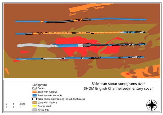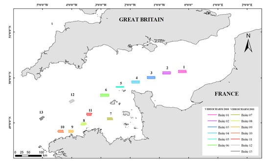 A complete acoustic coverage of each sampling box was carried out during the VIDEOCHARM surveys in 2010 and 2011 using side scan sonar (Figure 2) (for the methodology of the acoustic survey, see [33]). A visual analysis of the side scan sonar mosaic was conducted on board, and observations of the sediment types from grab samples and ROV footage were used to describe acoustic facies. Side scan sonar technology has been used successfully for many years to produce high-resolution acoustic maps of the seabed [17,18,19,33,34,35]. Typically, side scan sonar data are produced using a pair of transducers mounted on either side of a tow fish which is connected to a survey vessel by means of a cable. The sound emitted from the transducers ensonifies a continuous surface of seabed either side of the transducers [36]. Reflected sound received by the transducers from the surface of the seabed provides information on the nature (e.g., hardness, roughness, texture) of the sediments and the presence and disposition of seabed features (e.g., sand waves, rock outcrops, algae cover, and anthropogenic features) across the swathe [37]. For the VIDEOCHARM surveys, side scan sonar data were collected using the DF 1000 Edgetech (100–400 kHz) side scan sonar system in conjunction with data acquisition software. Data were processed, georeferenced and mosaiced using the ‘Caraïbes’ software package from IFREMER to produce continuous acoustic maps of the area surveyed. The vessel position was provided by a Thales 3011/Fugro SeaStar DGPS system, and the position of the side scan tow fish was calculated by using vessel heading, vessel offsets, tow cable layback and tow fish depth.