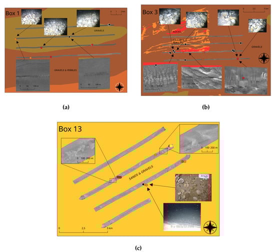 Example of scan sonar profiles collected during the VIDEOCHARM surveys in June 2010 ((a,b) boxes 1 and 3) and June 2011 ((c) box 13) with inset views for some areas of interest and snapshots of the surface sediments extracted from the ROV video footage.