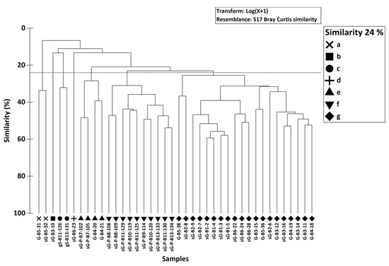 Cluster dendrogram showing the pattern of the 40 grab sampling stations (abundance per 0.5 m² of the accounted macrofauna retained on a 2 mm mesh sieve and 24% of similarity) according to the Bray–Curtis similarity after Log(X + 1) transformation of the abundances.