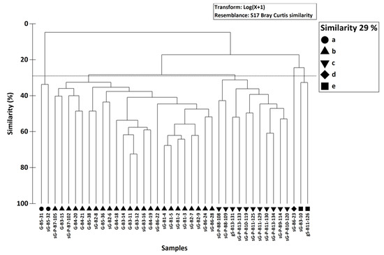 Cluster dendrogram showing the pattern of the 40 grab sampling stations (abundance per 0.5 m² of the accounted macrofauna retained on a 1 mm mesh sieve and 29% of similarity) according to the Bray–Curtis similarity after Log(X + 1) transformation of the abundances.