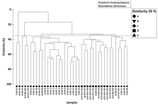 Cluster dendrogram showing the pattern of the 40 grab sampling stations (presence/absence of all taxa recorded per 0.5 m² of the motile and sessile macrofauna and 35% of similarity) according to the Sorensen similarity.
