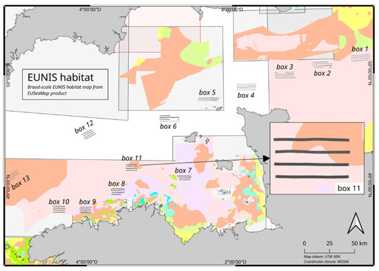 One of the aims of this study was to assess the diversity of coarse sediment offshore benthic habitats according to the EUNIS habitat classification [11,23,24,41]; https://www.eea.europa.eu/data-and-maps/data/eunis-habitat-classification-1 (accessed on 1 June 2022). Following the EUNIS 2012 classification, the sampling areas concerned two main habitats at Level 2—A5: sublittoral sediments and A4: circalittoral rocks and other substrata. Thus, the authors of [11] had modelled EUNIS map of the EC at this level of classification, and our study area corresponded in the eastern part (boxes 1 and 2) to the A5.14 habitat (circalittoral coarse sediment, i.e., MC32 Atlantic circalittoral coarse sediment of the EUNIS 2022 classification), while all the other boxes were classified as A5.15 habitat (deep circalittoral coarse sediment, i.e., MD2 offshore circalittoral coarse sediment of the EUNIS 2022 classification) (https://www.eea.europa.eu/data-and-maps/data/eunis-habitat-classification-1).