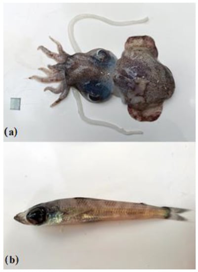 The deep sea demersal species considered in this study. (a) Neorossia caroli (Sepiolidae, Cephalopoda) and (b) Chlorophthalmus agassizi (Chlorophthalmidae, Osteichthyes).