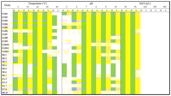 The results of the physiological tests are shown in Figure 2. The optimum growth temperature was identified to be 20 °C. More than half of the tested strains showed growth at 4 °C, and as many as 72% managed to grow up to 40 °C, even though at higher temperatures the bioluminescence was inhibited. The isolates CLD1, CLD5, CLD7, CLD9, CLD10, CLD12, and NE1 were not able to tolerate temperatures higher than 30 °C. The results of the different pH values tests showed that, in general, isolates tolerate acidity conditions poorly. The optimum condition was detected to be 7 pH value, and 3% of the tested bacterial strains were able to grow in a range between 6 and 10 pH values, in some cases without bioluminescence. Only two strains (CLD1 and CLD5) showed growth at pH 5 and maintained their bioluminescence. Salinity tests showed that all bacterial strains grew up to a final concentration of 50 g/L NaCl in the isolation media. However, in some cases, the bioluminescence was inhibited by the salt addition at the final NaCl concentration of 50 g/L, namely, in the case of isolates CLD6, NE6, and NE7. No strain was able to tolerate salinity concentration higher than 50 g/L.