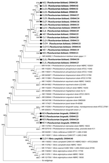 - Ast, J.C.; Cleenwerck, I. Photobacterium kishitanii sp. nov., a luminous marine bacterium symbiotic with deep-sea fishes. Int. J. Syst. Evol. Microbiol. 2007, 57, 2073–2078. [Google Scholar] [CrossRef]