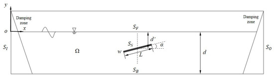 Figure 1 shows the schematic diagram of the considered problem in two-dimension. The applied Cartesian coordinate system is also shown: the x-axis is positive when pointing to the right and its origin is at the left end of the tank, and the y-axis is positive upward with y = 0 at the mean water surface, and d is the water depth. In theory, the fully nonlinear numerical wave tank (NWT) established in this work can simulate nonlinear wave evolution in the water of an arbitrary depth [27], although only shallow and intermediate water depths are considered in this work. The submerged inclined plate is characterized by the inclination angle α and the submergence d’ (the vertical distance between the plate center and the mean water surface). L and w are the length and the thickness of the plate, respectively. These two were kept constant in this work, and the submerged inclined plate was placed at the mid-aft of the NWT.