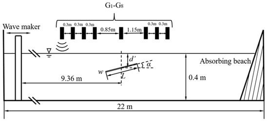 Then, an inclined submerged plate is placed at x = 9.36 m for nonlinear wave-plate interactions. The structure dimensions considered in both physical experiments and the numerical simulations are: the inclined angle α = 30°, the submerged depth d’ = 0.25 m, the plate thickness w = 0.01 m, and the plate length L = 0.4 m, see Figure 2. Again, the wave period T = 1.2 s and wave amplitude a = 0.02 m were used here for validation.