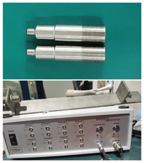 A set of ultrasonic wave gauges, G1–G4, were placed on the weather side of the plate with a constant spacing of 0.3 m for resolving the reflected waves. G5 was placed directly above the submerged plate, and the distance between G4 and G5 was 0.85 m. Three wave gauges, G6–G8, were placed on the leeward side of the plate to resolve the transmitted waves. The spacing was also 0.3 m, and the distance between G5 and G6 was 1.15 m. It should be noted that the wave gauges were numbered sequentially from left to right in Figure 2, i.e., the leftmost wave gauge was labeled G1, and the rightmost was G8. The wave gauges and its acquisition system are shown in Figure 4.