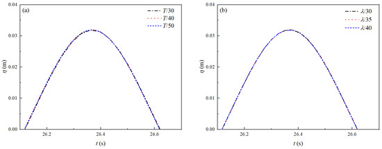 The time series of the free surface elevation at x = 8λ calculated using (a) three different time steps; and (b) three different mesh sizes.