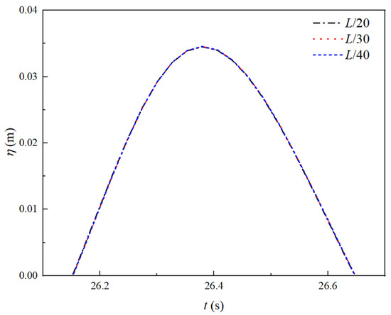 Similar to the simulations in Figure 5 and Figure 6, a convergence analysis is firstly carried out, see Figure 7, where the time series of the free surface elevation calculated by the three different mesh sizes are shown. The background mesh (i.e., the mesh for the pure wave tank) is the same as those in Figure 5, and the mesh size on the plate surface is tested here. According to Figure 7, the medium mesh of L/30 is then selected for use in this work.