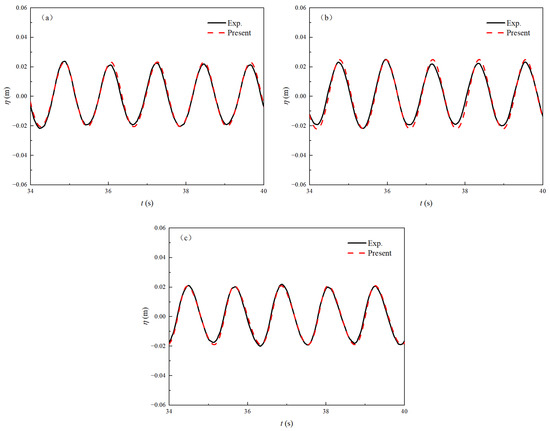 Figure 8a–c shows the comparisons between the experimental and numerical results for G1 on the weather side, G5 directly above the plate, and G7 on the leeward side (see Figure 2), respectively. These confirm NWT’s ability to simulate nonlinear wave-submerged plate interactions.