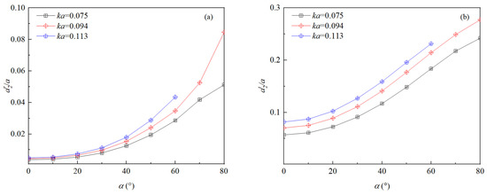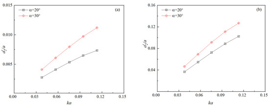 The variations of the wave amplitudes of both the second-order reflected and transmitted free waves with the wave steepness ka are further investigated in Figure 11a,b, respectively. Obviously, their amplitudes increase gradually with the wave steepness ka. Moreover, it is found that they follow a quadratic relationship, although the coefficients for the reflected and transmitted waves and for each inclination angle may be different. More specially, they satisfy