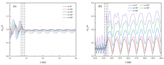 Figure 12a,b shows the spatial distribution of first-order and second-order harmonic amplitudes along the x direction, respectively. The separated harmonics can be obtained by applying the Fourier transform of Equation (10). Figure 12a shows the spatial distribution of the first-order harmonic wave amplitude, i.e., linear component. It can be seen that its amplitude tends to decrease with the inclination angle. It can be seen that in the range of working conditions considered, the larger the inclination angle of the submerged plate is, the better the wave dissipation performance is, which coincides with the information reflected in Figure 9.