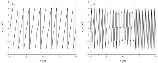 Then we study the phase variation of the first-order and the second-order harmonics along the x direction in Figure 10. It can be seen that for the first-order harmonic wave (Figure 13a), the period of the phase behind the plate is slightly smaller than that in front of the plate. While for the 2nd-order harmonic wave, an obvious sub-peak in the phase curve after x = 5 m and before the plate is observed. This may be introduced by the wave reflection from the submerged inclined plate. Comparing Figure 13a to Figure 13b, we found that the period of the phase of the first-order harmonic wave in front of the plate was exactly twice that of the second-order harmonic wave. However, there is no obvious relationship in terms of the harmonic waves behind the plate.