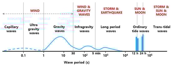 Ocean waves are categorized by their height, period, and the water depth in which they are propagating. Wave generating mechanisms (e.g., wind, tide, earthquakes, etc.) are associated with creating waves in a characteristic frequency range. Wind-generated waves are the primary type pertaining to this study, and have periods ranging from fractions of a second, up to about five minutes for infragravity waves in the open ocean [] (Figure 1). Most numerical modelers are concerned with waves with periods greater than one second, and less than 30 s []. Waves in this range of periods are called wind-generated gravity waves, as gravity is the restoring force pulling the wave crests downward. Surface tension takes over as the primary restoring force for waves with periods much lower than one second, and are regarded as capillary waves []. Long period waves, with periods ranging from minutes to days, Figure 1, are also included in the numerical models as periodic forcing frequencies, which mainly simulate tides [].