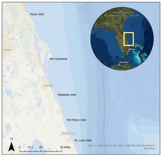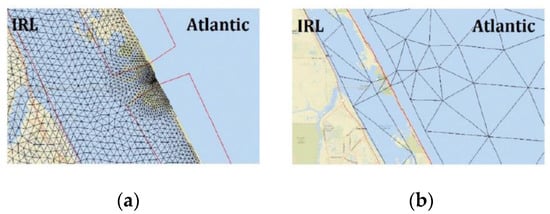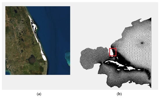 Water elevations at the open inlet boundaries of the fine mesh were fed from corresponding nodes within the parent model’s coarse mesh; an adaptation of the ec95 ADCIRC mesh used in ASGS [], Figure 3b. Spacings between nodes in this grid are on the order of tens to hundreds of kilometers. To ensure a more accurate depiction of elevation at nodes associated with open boundaries in the fine mesh, the ec95 course domain was modified to include a rudimentary rendering of the Indian River Lagoon, Figure 4b [].