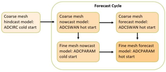 Collections of two-stage models were wrapped into a complete system inspired by the ADCIRC Surge Guidance System [,], automating model set up and splitting MMEMS simulations into three steps: hindcast, nowcast, and ensemble forecast, Figure 5. The hindcast included a single ADCIRC run on the parent coarse mesh and served to spin up tidal and meteorological conditions from cold start prior to the nowcast. The generated hot start file was used to launch the parent grid coarse model simulation in the nowcast stage, which then fed boundary conditions to its nested high-resolution estuarine model. The two-stage nowcast applied waves to both the coarse and fine domains and ramped up all model conditions to produce hot start files for each of the forecast members. The nowcast ran from 1–3 days before the current cycle to the start of the meteorological forecast cycle, exceeding the required spin up time for the Indian River Lagoon mesh, Figure 3a) []. The coarse and fine mesh stages of forecast members started on this cycle and ran for the length of their respective meteorological inputs, or about 3 days. Waves might be omitted from coarse mesh stages to improve run time, but at the cost of model solution during storm events []. Left alone and with ample disk space, continuous power and connectivity, the MMEMS would continuously model forecast cycles as they were picked up from the NOMAD Server.