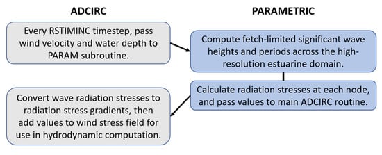 Development of ADCparam involved the integration of PARAM into the main ADCIRC loop as a simple subroutine, Figure 6, that also required a series of cascading edits throughout the network of ADCIRC source code. Similar to ADCIRC + SWAN, the values passed from the wave model to the hydrodynamic model are radiation stress gradients, which must be normalized with water density before being added to ADCIRC wind stress gradients []. The PARAM subroutine was written into the primary timestep script to be prompted at a set wave calculation interval (RSTIMINC) if NWS = 5XX in the ADCIRC control file, where NWS was the specifier determining the form of wind and/or wave stresses to apply to the model. The interval RSTIMINC, typically set to 600 s, determined how often wave parameters and stresses were updated in the model. ADCIRC script reading in the control file was expanded to interpret the NWS specifier for PARAM waves, the wave calculation interval, and settings for time series output of wave heights, periods, and radiation stress gradients. Variables passed between the PARAM subroutine, radiation stress gradient function subroutine, main ADCIRC loop, and the output writer were all pre-allocated in a global script. Source codes initiating model conditions and output files were also amended to include PARAM parameters. In order to run ADCparam in parallel with multiple processors, prep functions were edited to partition PARAM input files for fetch, depth, and slope to match domain mesh file partitioning. All PARAM additions to ADCIRC source code included related parallel execution specifiers to note if indexes were in line with respect to local sub-processing loops.