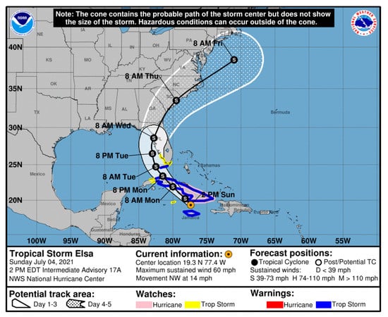 - National Hurricane Center. 2021 Tropical Cyclone Advisory Archive. 2021. Available online: https://www.nhc.noaa.gov/archive/2021/ (accessed on 8 August 2022).